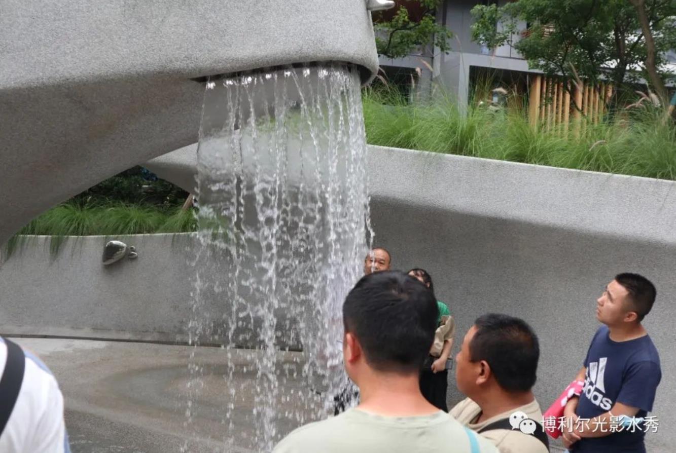 第二階段為學(xué)習(xí)實(shí)踐,由項(xiàng)目經(jīng)理黃石龍帶領(lǐng),參觀G13到G12的各個(gè)互動(dòng)水景設(shè)備及機(jī)房。學(xué)習(xí)珍珠跳泉的新型安裝方式,管道如何安裝才能增大水珠顆粒。數(shù)字水簾對(duì)人體感應(yīng)、玻光跳泉的對(duì)沖效果、扇泉瀑布的落地方案、冷霧水霧的多方式使用安裝、燈光設(shè)備與水景設(shè)備的融合性。機(jī)房?jī)?nèi),互動(dòng)軟件的使用,水泵的安裝、管道走向以及控制柜內(nèi)液位檢測(cè)器的合理使用。